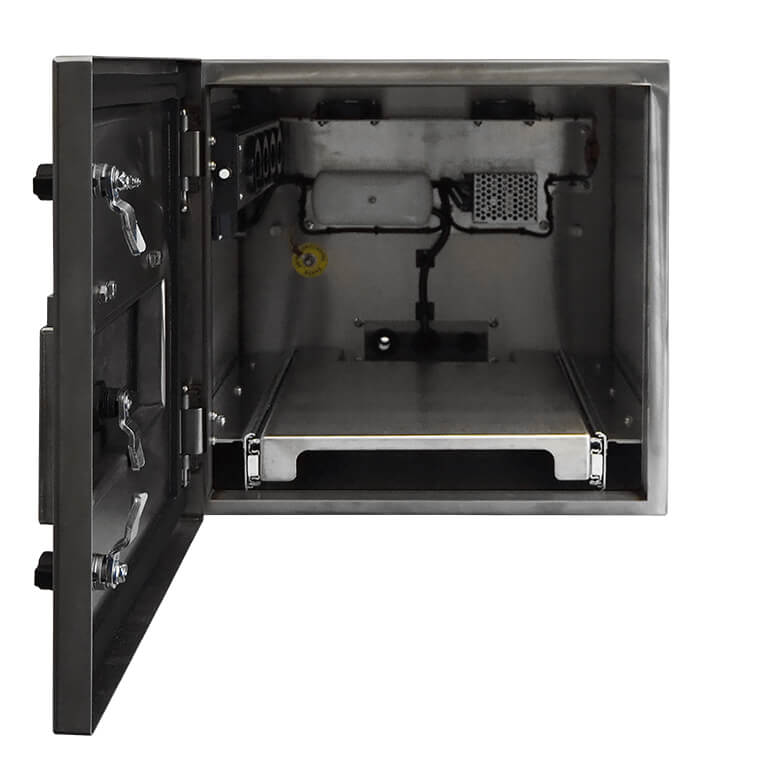 De RVS labelprinter kasten maximaliseren de uptime door ervoor te zorgen dat printers 24/7 betrouwbaar werken. Een interne ventilator voorkomt warmteophoping en een optionele verwarming beschermt de printkoppen in koude omgevingen. Een klep aan de voorkant maakt het gemakkelijk om afdrukken op te halen, waardoor het personeel een efficiënte workflow krijgt. De printer staat op een schuiflade, voor het eenvoudig wisselen van papierrollen.
