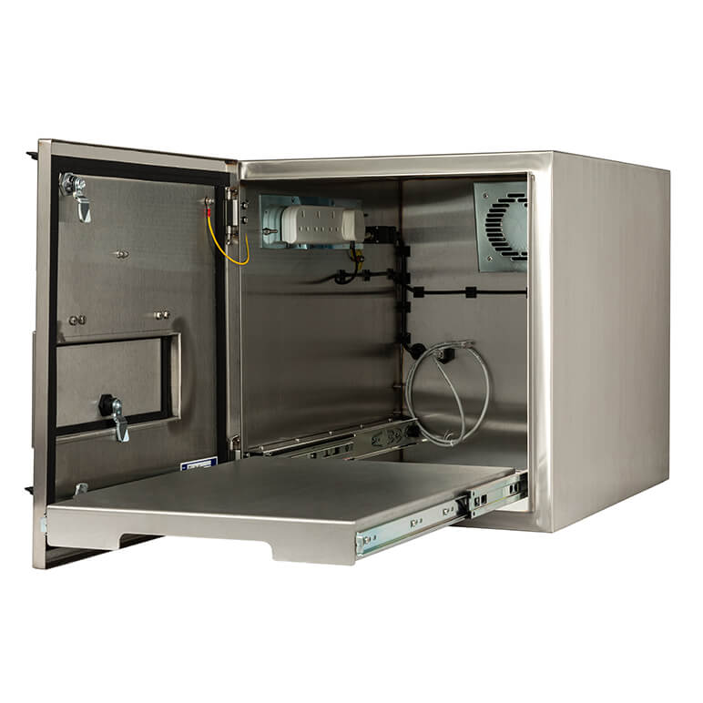 | Meerdere Montagemogelijkheden | De RVS printerbehuizing kan op elk stabiel oppervlak worden gemonteerd, of op een optionele standaard/trolley of bovenop één van onze vloerstaande behuizingen. |